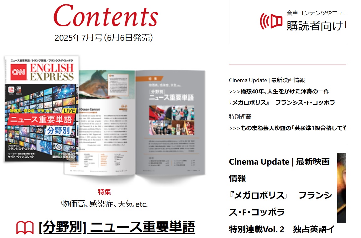 CNN English Express 2025年7月号 特集は「ニュース重要単語」あらゆる社会問題に切り込むニュース記事から物価高、感染症、天気、AIなど幅広いジャンルをピックアップ、米国各州の魅力に迫る新連載は「STATESIDE VOICES」初回の今回はカリフォルニア州でサーフィンの聖地を特集。その他盛りだくさん。